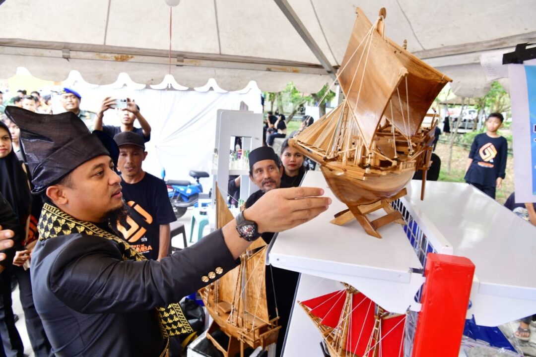 Gubernur Sulsel Andi Sudirman Sulaiman melihat sebua produk kerajinan Kapal Phinisi pada pameran UMKM di Bulukumba, Minggu )5/2/2023).