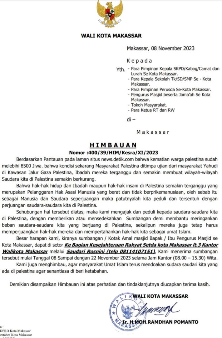 “Besar harapan kami, kiranya sumbangan / Kotak Amal masjid Bapak/Ibu Pengurus Masjid se Kota Makassar, dapat disetor Ke Bagian Kesra Setda kota Makassar It.3 Kantor Walikota Makassar melalui Saudari Rosnini (telp 08114107151), Kami menerima sumbangan tersebut mulai Tanggal 08 Sampai dengan 22 November 2023 selama Jam Kantor (08.00-15.30) Wita,” tertulis dalam surat himbauan.