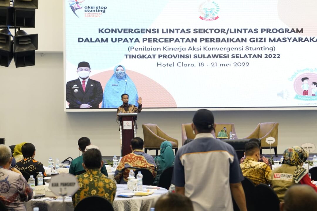 MAKASSAR, LINISIAR.ID — Gubernur Sulawesi Selatan, Andi Sudirman Sulaiman menghadiri dan membuka acara Konvergensi Lintas Sektor/Lintas Program Dalam Upaya Percepatan Perbaikan Gizi Masyarakat (Penilaian Kinerja Aksi Konvergensi Stunting) Tingkat Provinsi Sulawesi Selatan 2022 di Hotel Claro, Makassar, Kamis 19 Mei 2022.