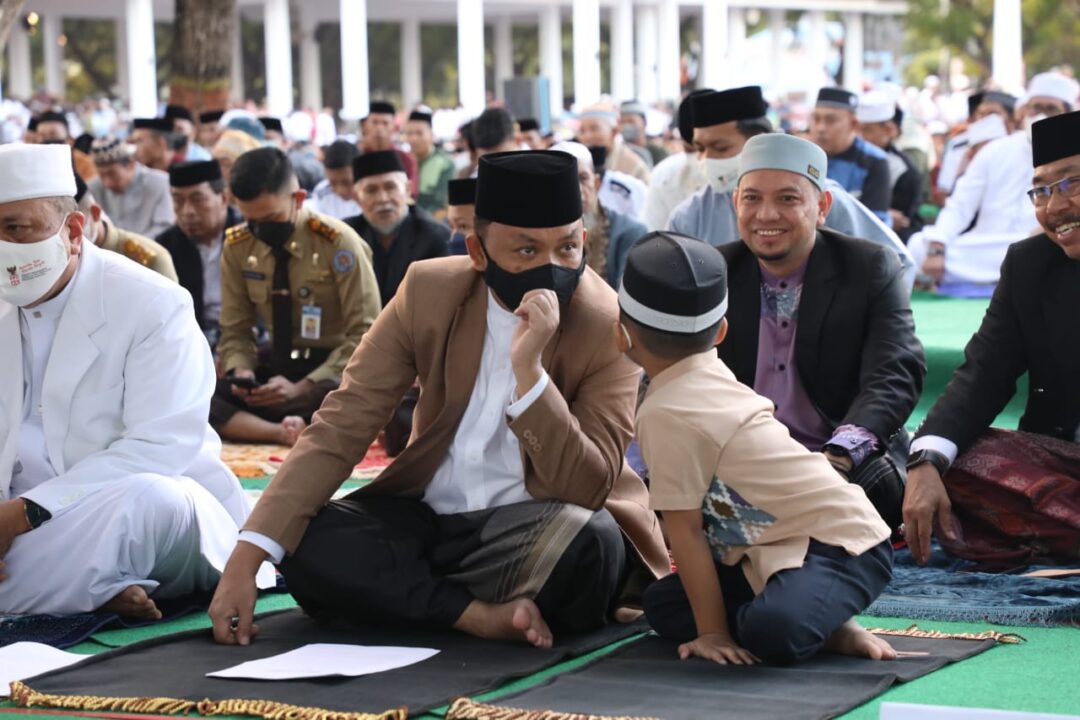 Bupati Bantaeng, Ilham Syah Azikin bersama Wakil Bupati Bantaeng, Sahabuddin para unsur Forkopimda, Ketua TP PKK Bantaeng, Sri Dewi Yanti, dan Ketua GOW Bantaeng, Rahma Arsyad mengikuti pelaksanaan Sholat Idul Fitri bersama masyarakat Bantaeng di Lapangan Pantai Seruni, Senin (2/5/2022).