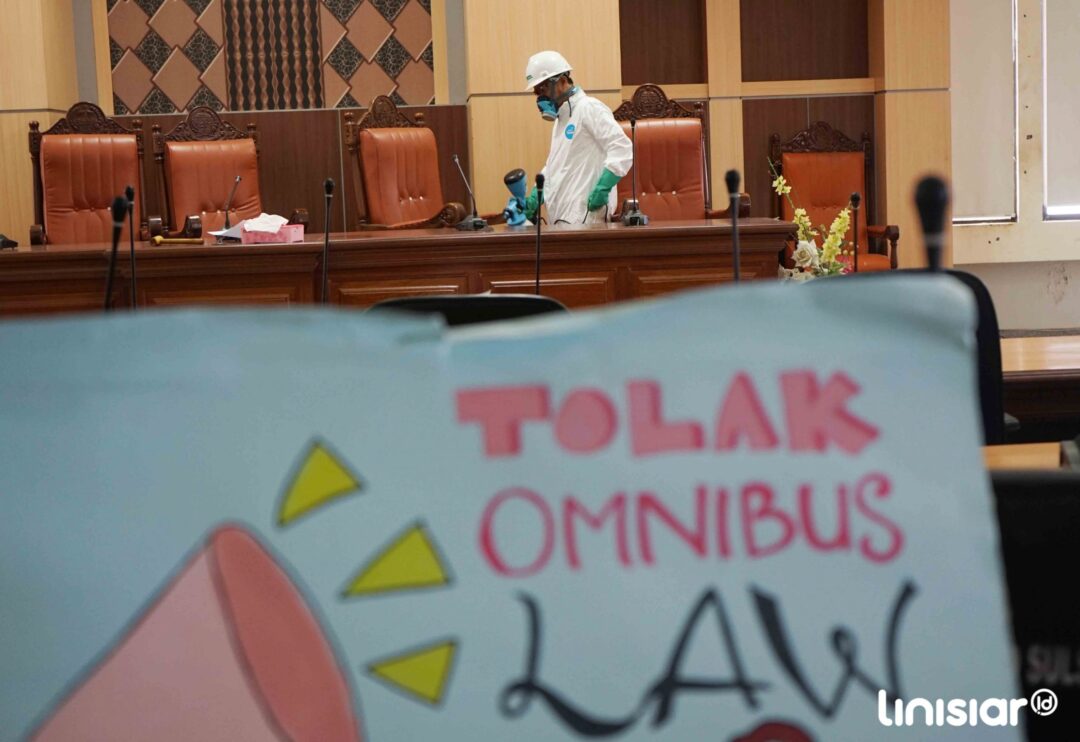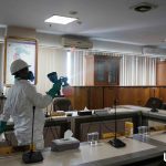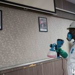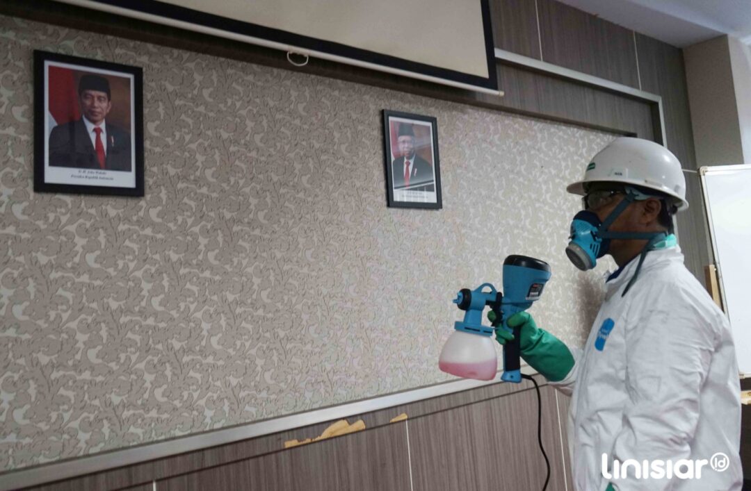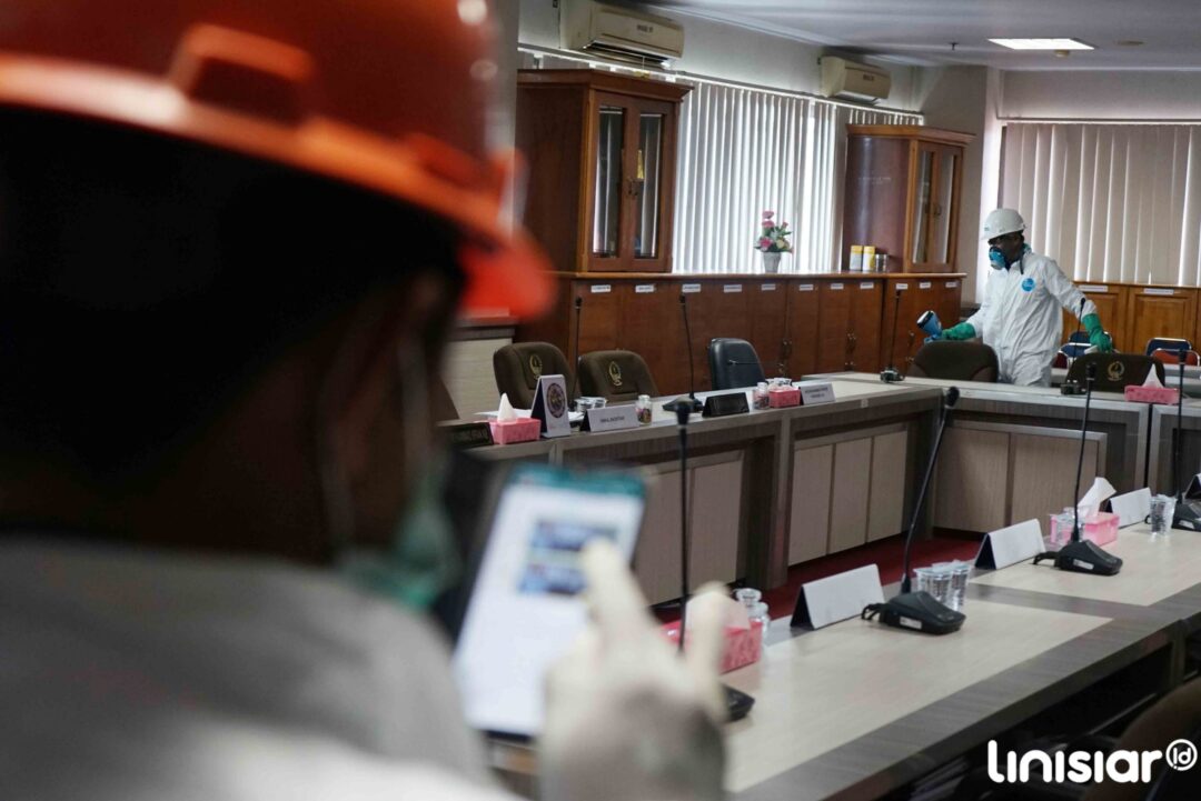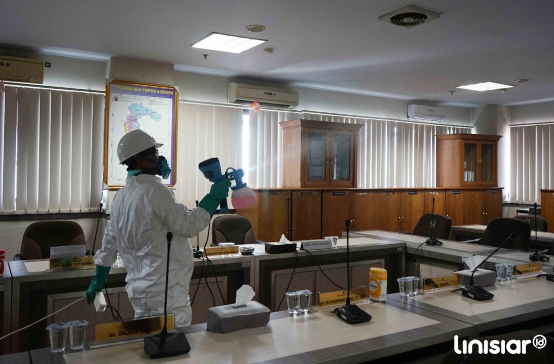 MAKASSAR, Linisiar.id – Petugas menyemprotkan cairan disinfektan ke bagian ruangan kantor Dewan Perwakilan Rakyat Daerah Sulsel, Makassar, Minggu (22/3/2020). Penyemprotan pada Kantor pemerintahan guna mengantisipasi penyebaran virus COVID-19.