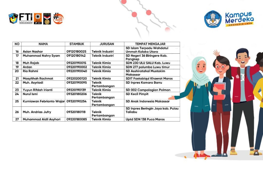 MAKASSAR, Linisiar.id – Sebanyak 27 mahasiswa Fakultas Teknologi Industri (FTI) Universitas Muslim Indonesia (UMI) Makassar berhasil lolos seleksi dalam Program Kampus Mengajar yang diselenggarakan oleh Direktorat Jenderal Pendidikan Tinggi Kementerian Pendidikan dan Kebudayaan Republik Indonesia