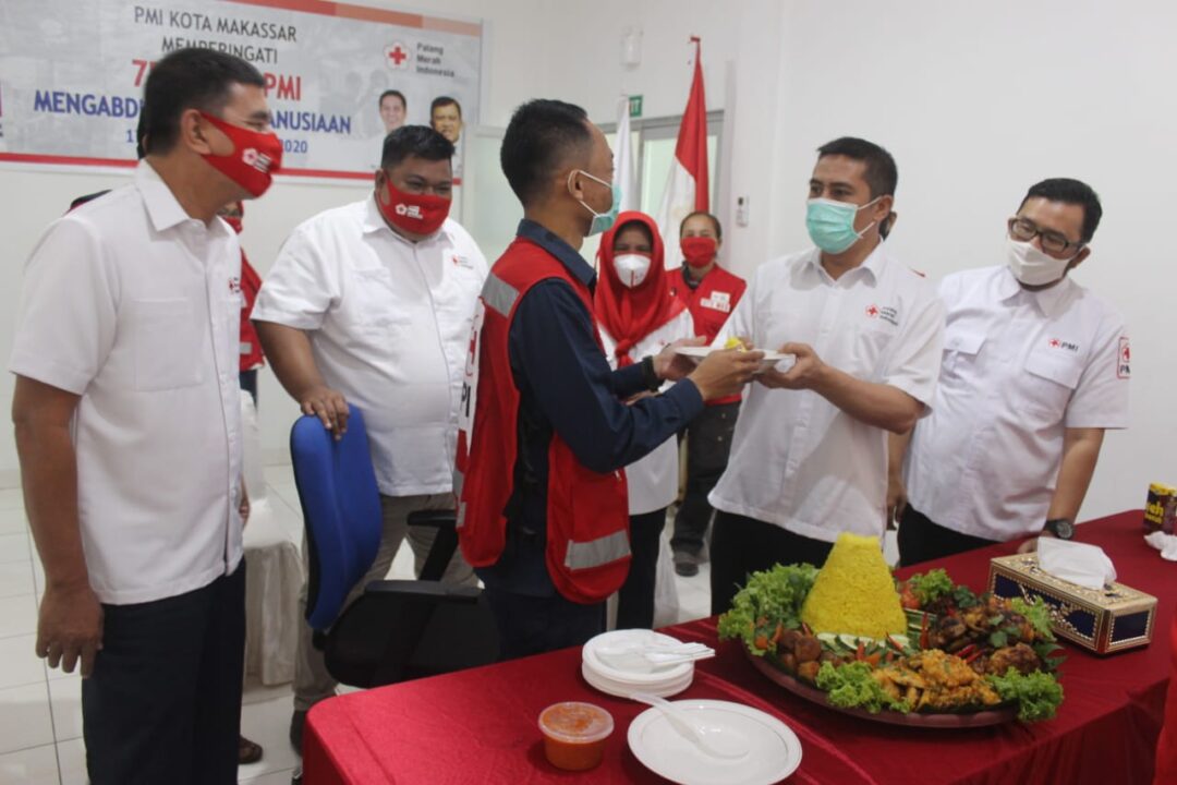 MAKASSAR, Linisiar.id – Ketua PMI Kota Makassar, Dr Syamsu Rizal, menyerahkan potongan tumpeng pertama untuk relawan saat perayaan Hari Ulang Tahun Palang Merah Indonesia (PMI) ke-75 di Markas PMI Kota Makassar, Jalan Kandea, Kamis, 17 September 2020.