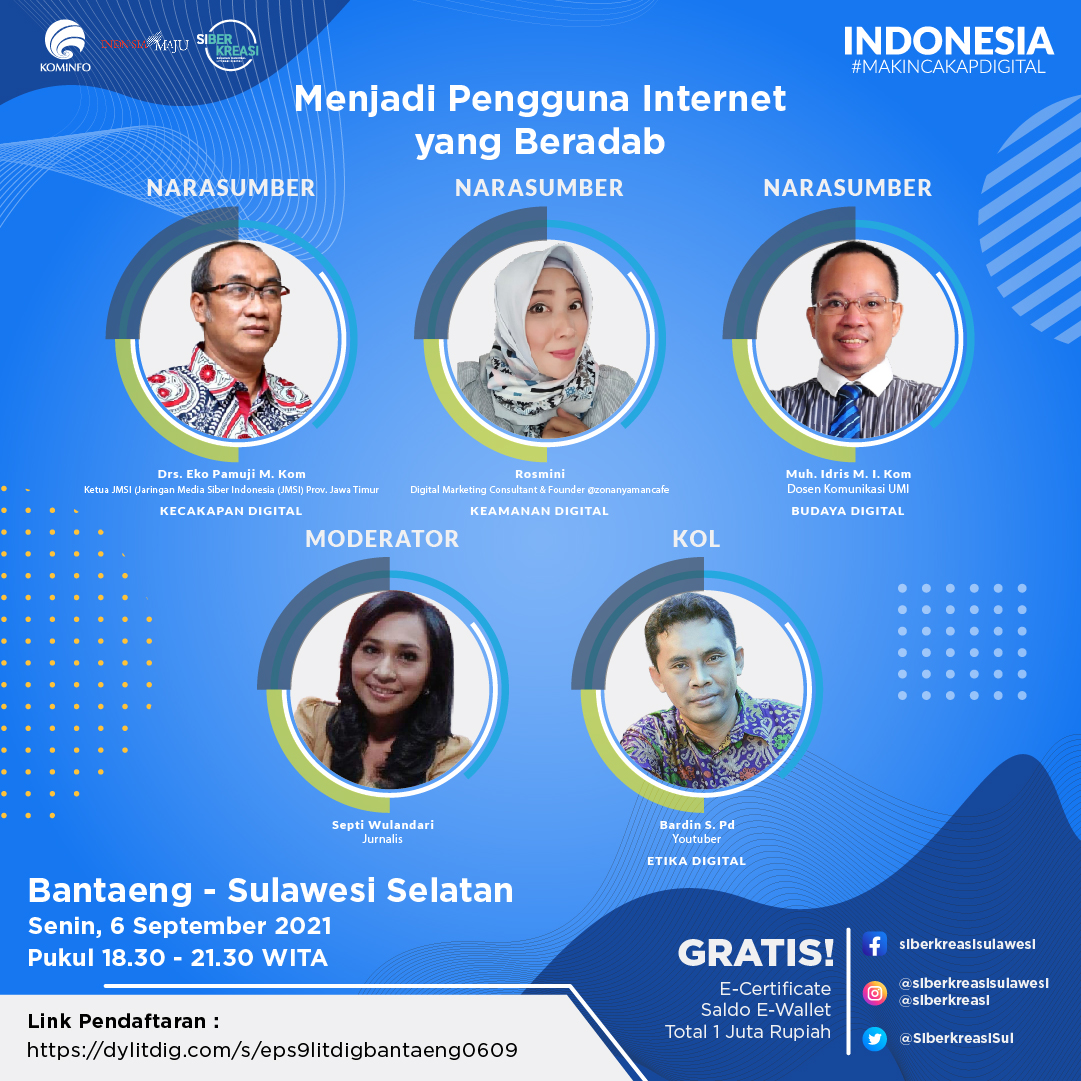 Program Literasi Digital “Indonesia Makin Cakap Digital” di Sulawesi akan diselenggarakan secara virtual mulai dari Mei 2021 hingga Desember 2021 dengan berbagai konten menarik dan materi yang informatif yang disampaikan narasumber terpercaya.