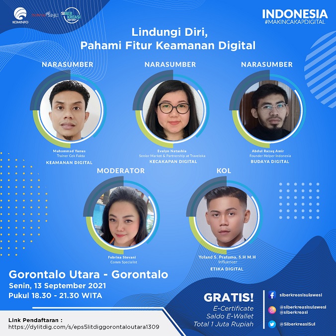 GORONTALO UTARA, Linisiar.id – Rangkaian Program Literasi Digital “Indonesia Makin Cakap Digital” di Sulawesi, yang diselenggarakan oleh Kementerian Komunikasi dan Informatika Republik Indonesia dan Siberkreasi bersama Dyandra Promosindo, dilaksanakan secara virtual pada 13 September 2021 di Kabupaten Gorontalo Utara, Provinsi Gorontalo.