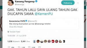 “Enggak. Tahun lalu saya ulang tahun enggak diucapin sama @KemenPU,” kicau pengguna Twitter yang menuliskan ‘Infrastruktur senam yang multitalenan | Ahli dan pengamat segitiga’ di profilnya itu.