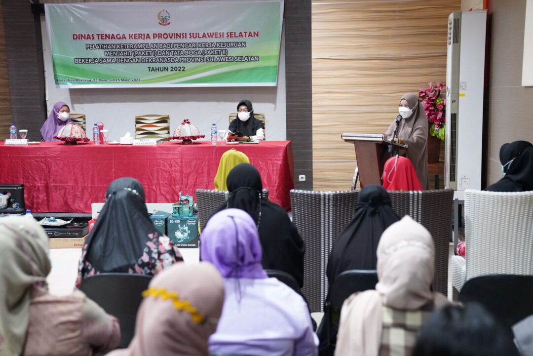 MAKASSAR, LINISIAR.ID – Ketua Dewan Kerajinan Nasional Daerah (Dekranasda) Sulsel Naoemi Octarina membuka pelatihan keterampilan bagi pencari kerja kejuruan menjahit (Paket I) dan Tata Boga (Paket II) Bekerjasama dengan Dekranasda provinsi Sulsel tahun 2022 yang dilaksanakan di hotel Tree, jalan Pandang Raya, Rabu, 23 Maret 2022.
