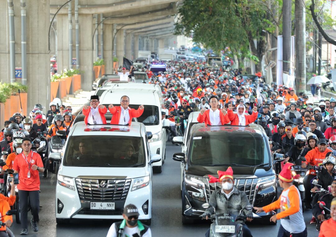 Mereka dengan antusias mengantar dan menyaksikan pasangan favoritnya menuju ke KPU Sulsel, Kamis, 29 Agustus 2024.