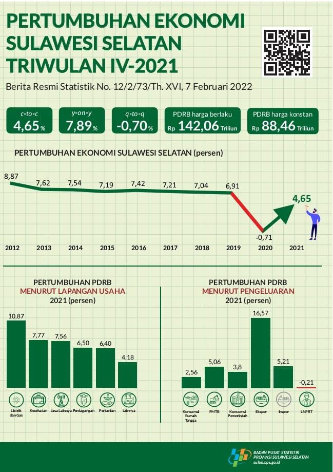 MAKASSAR, Linisiar.id – Badan Pusat Statistik (BPS) Sulsel mencatat perekonomian Provinsi Sulawesi Selatan secara kumulatif sepanjang 2021 berhasil tumbuh positif mencapai 4,65 persen. Angka ini lebih baik dibandingkan 2020 yang mengalami kontraksi 0,71 persen.