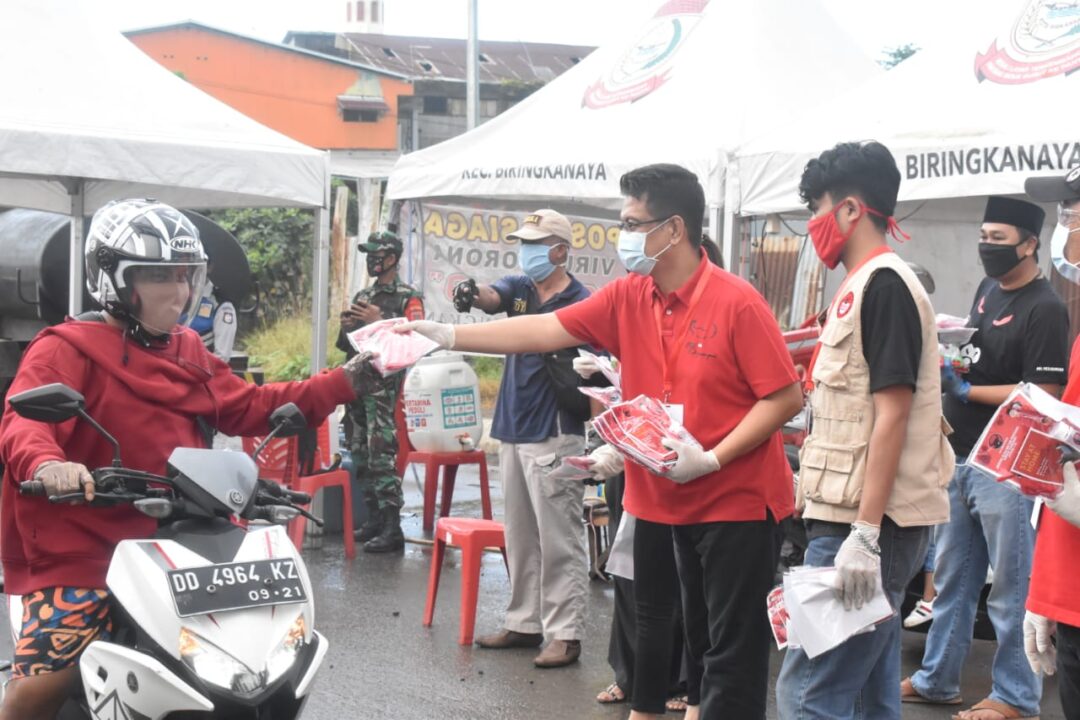 Selain menyalurkan minuman sehat juga membagikan masker dan hand sanitizer kepada warga masyarakat dan pengguna jalan di Kota Makassar, Jumat, (8/5/2020).