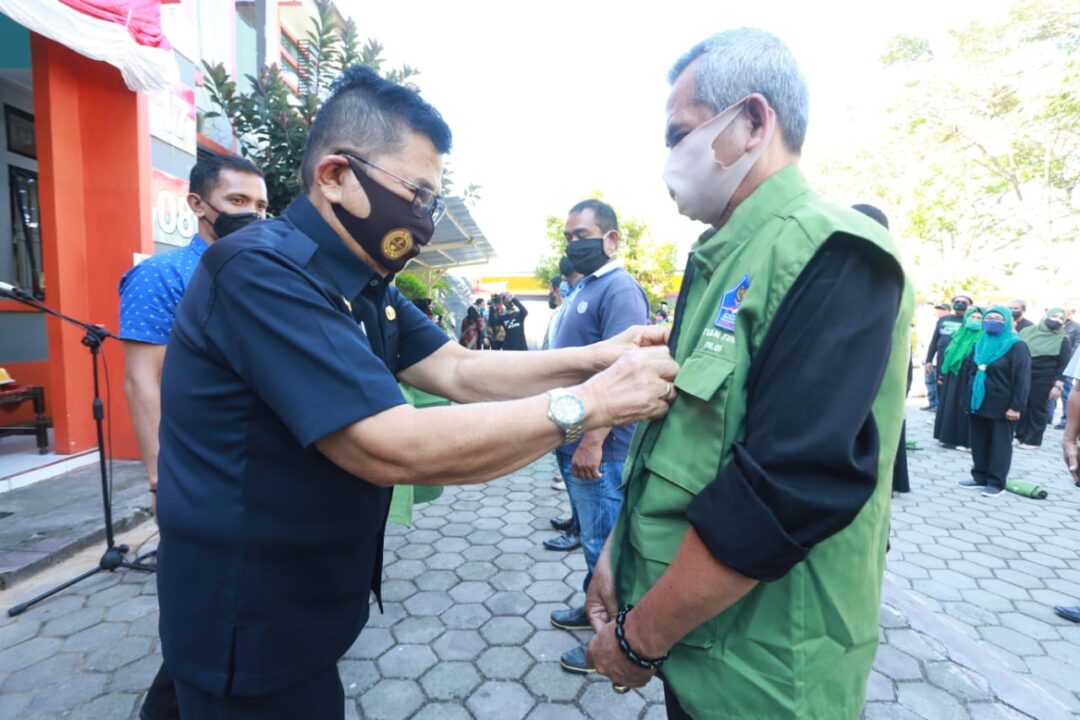 Pada kesempatan itu, Walikota Palopo menyerahkan secara simbolis rompi Satgas Covid-19 kepada seluruh ketua RT/RW se-Kecamatan Wara.