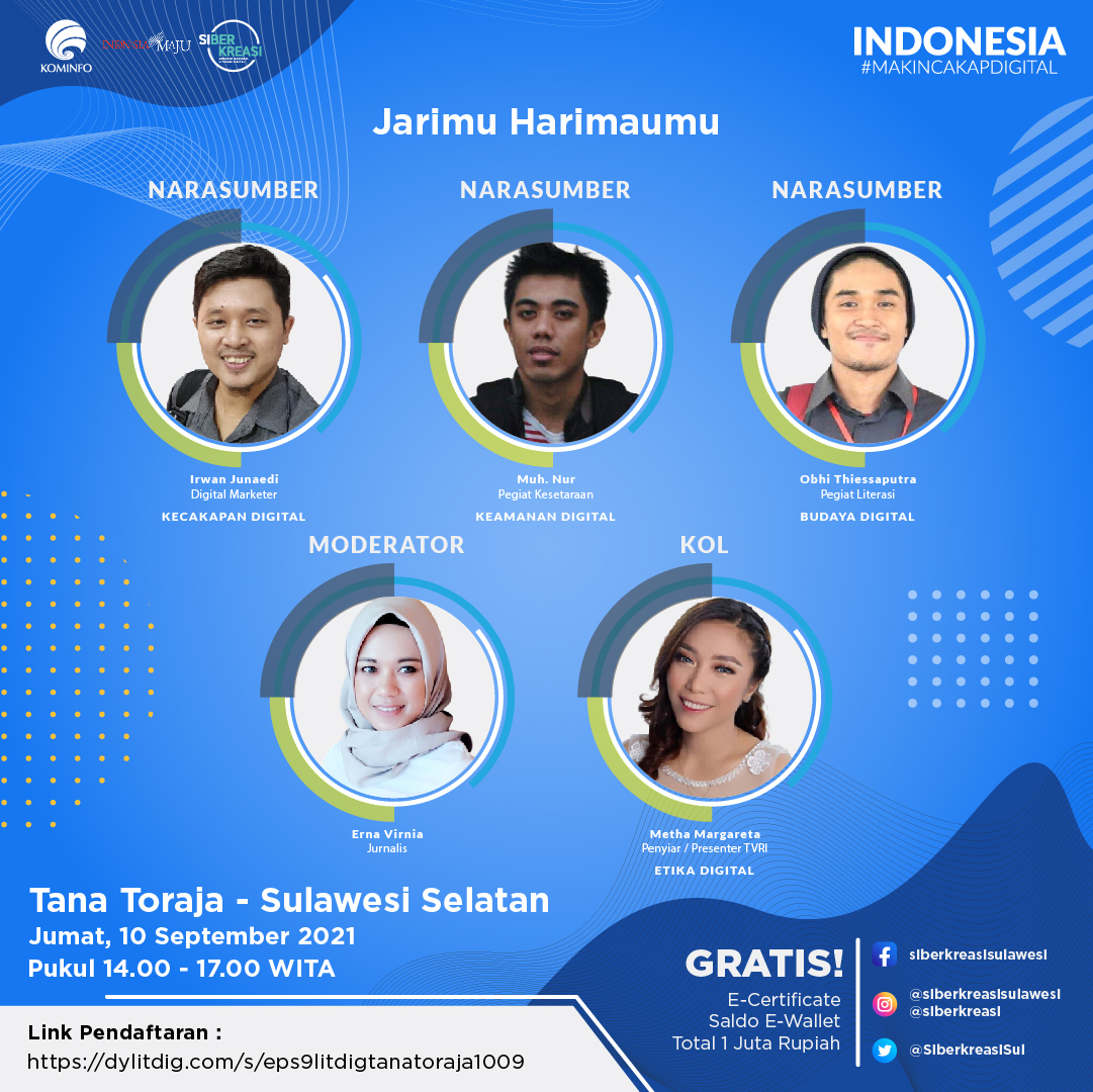 Bagi masyarakat yang ingin mengikuti sesi webinar selanjutnya, informasi bisa diakses melalui https://www.siberkreasi.id/ dan akun sosial media @Kemenkominfo dan @siberkreasi, serta @siberkreasisulawesi khusus untuk wilayah Sulawesi.